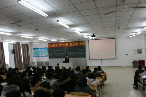 讲座开展前的一周,邓雨巍书记开始深入调查学生对十九大精神的了解情况,与学院教师们进行多次会议商讨,如何将十九大精神、习近平新时代中国特色社会主义思想带入校园,学生干部积极配合老师工作,带领学生们在课余时间建立小组共同探讨学习十九大精神。每日黄昏过后,邓书记的办公室里总是灯火通明,彻夜修改稿件,为在讲座中更全面的向学生们传达党的十九大精神做着充分准备。她围绕在新时代进程中擦亮初心、在民族复兴中坚守初心、在自我革命中砥砺初心三个视觉角度,就大学生如何理解习近平新时代中国特色社会主义思想进行了深入浅出的生动解读。