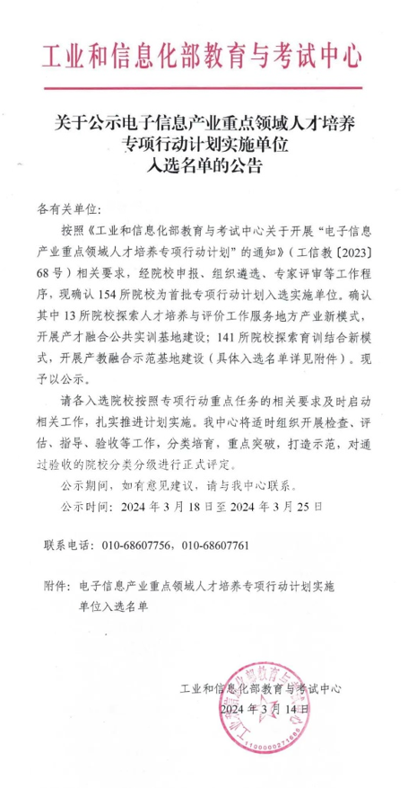 近日,工业和信息化部教育与考试中心公示了电子信息产业重点领域人才培养专项行动计划实施单位入选名单,我院经过激烈的申报竞争和线上答辩,成功入选首批拟建产教融合示范基地实施单位。