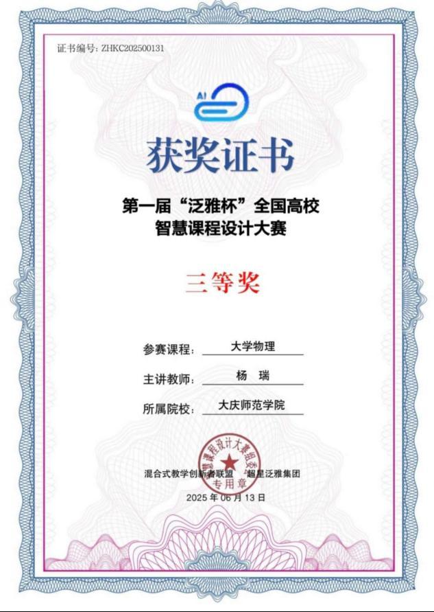 7月31日,由混合式教学创新者联盟与超星泛雅集团主办,华东师范大学、山东大学等19所高校联合主办的首届“泛雅杯”全国高校智慧课程设计大赛在超星尔雅科技园圆满落幕。经过激烈角逐,评选出特等奖3项、一等奖10项、二等奖39项、三等奖181项、优秀奖370项。球王会官网,球王会体育再传捷报!杨瑞老师负责的大学物理教学团队凭借《大学物理》课程设计,从全国数百所高校1619件参赛作品里脱颖而出,荣获全国三等奖。