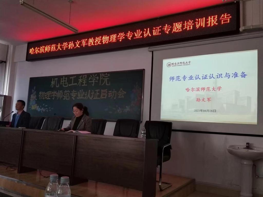 为推动球王会官网,球王会体育物理学师范专业认证工作顺利开展,提升认证工作质量。2023年4月26日,我院特邀哈尔滨师范大学孙文军教授于306多功能会议室作题为“师范专业认证认识与准备”专题培训讲座。会议由我院教学负责人王玉玲教授主持,教务处张国发副处长出席会议、机电学院院长刘永皓教授、机电全体教师、生物工程、体育、化学工程、计算机科学与技术等相关学院的领导和部分教师参会。