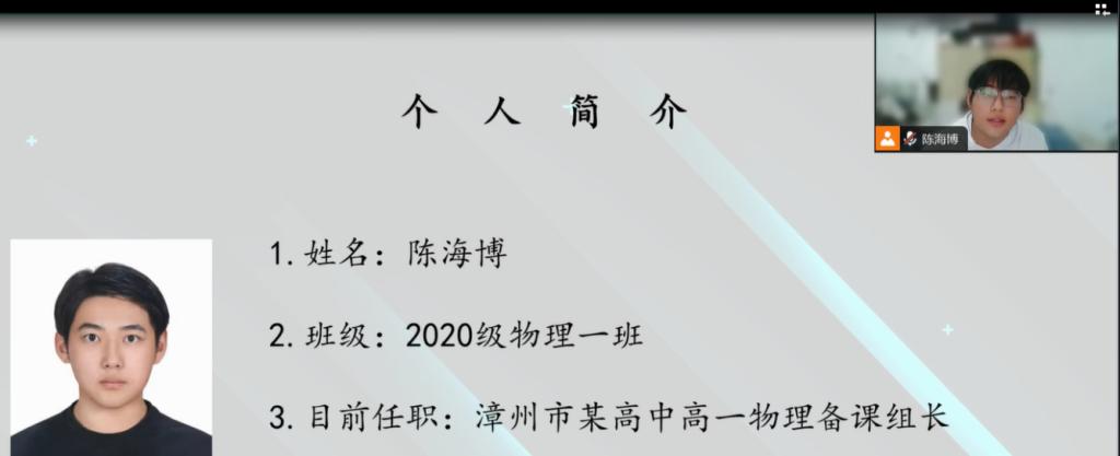 福建入职同学陈海博通过腾讯会议在线上为同学们分享了自己的福建漳州就职经历,鼓励大家要珍惜实习机会、在实习中不断专研、探索,提升自身的专业技能以夯实就业竞争力。