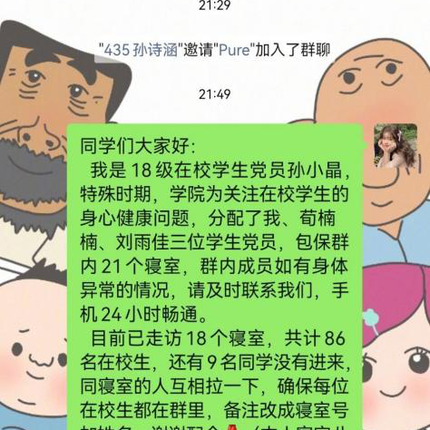 在疫情防控的特殊时期,通过包保制度,有效提升了监督成效,规范了学生居寝生活,有针对性的开展人文关怀,缓解了疫情封控带来的压力,学生党员在打赢疫情保卫战,守护校园一方净土中积极贡献着自己的力量。