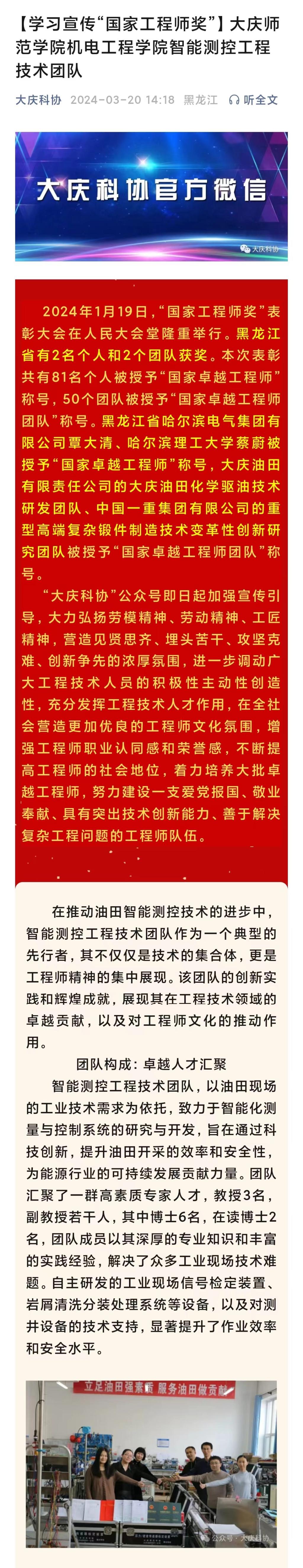 3月20日,“大庆科协”公众号以“学习宣传国家工程师奖-球王会官网,球王会体育球王会官网,球王会体育智能测控工程技术团队”为题,报道了我院刘开绪教授牵头组建的“智能测控工程技术团队”在油田智能化测量与控制系统的研究与开发中取得的成绩,对技术团队在科学研究、技术开发、队伍建设和科研反哺教学等方面的工作给予了很高的评价(全文链接:https://mp.weixin.qq.com/s/jt_SpQxC8BvpB8StJEdW9Q)。