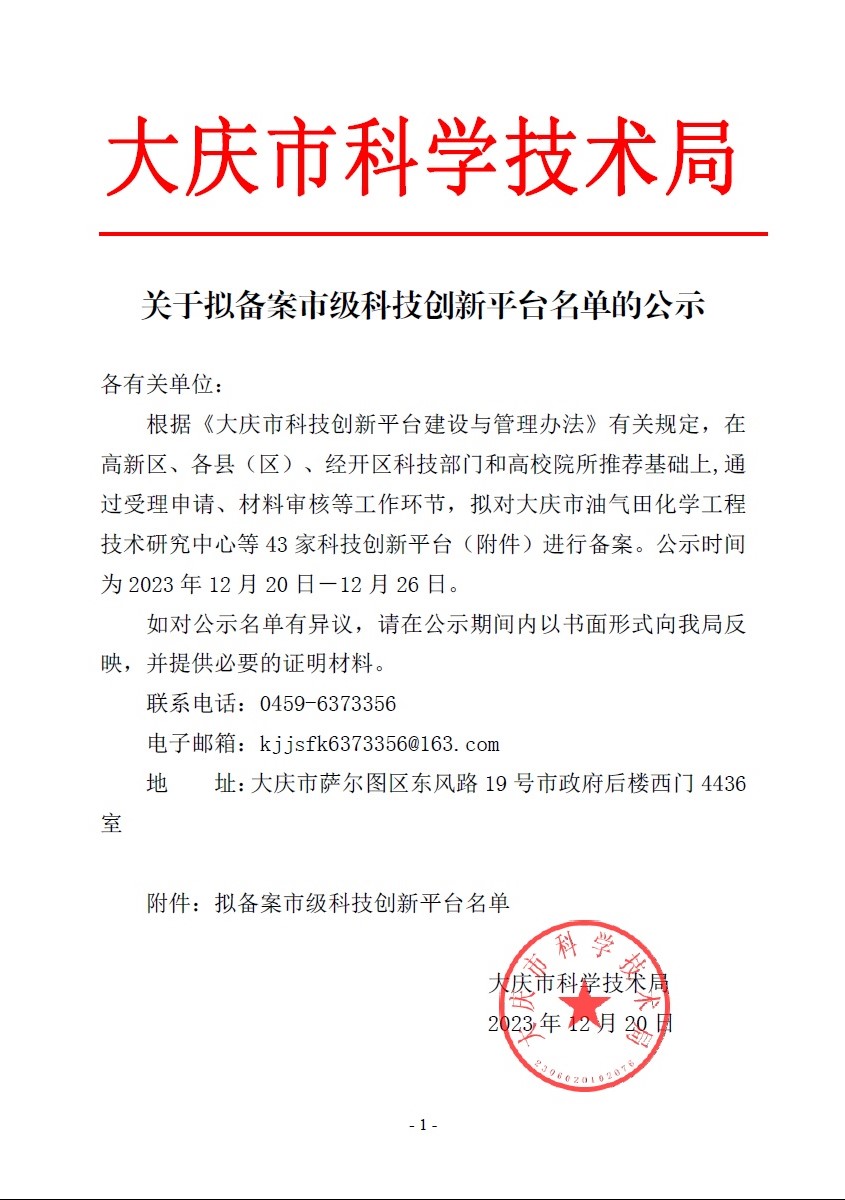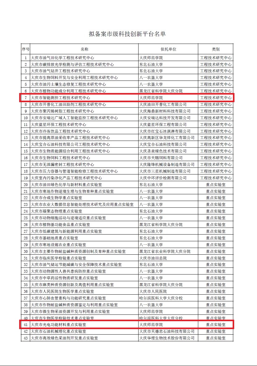 近日,大庆市科学技术局公布了市级科技创新平台名单,全市合计43家科技创新平台入选。我院申报的“大庆市智能测控工程技术研究中心”、“大庆市光电功能材料重点实验室”成功获批备案。