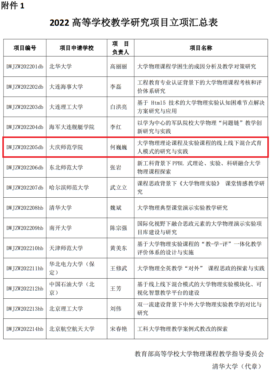 8月3日,2022年度教育部高等学校大学物理教学指导委员会教学研究项目立项名单正式发布,我院基础物理教研室主任何巍巍老师主持的“大学物理理论课程及实验课程的线上线下混合式育人模式的研究与实践”项目成功获批。全国各类院校获批立项40项,东北地区仅7项。