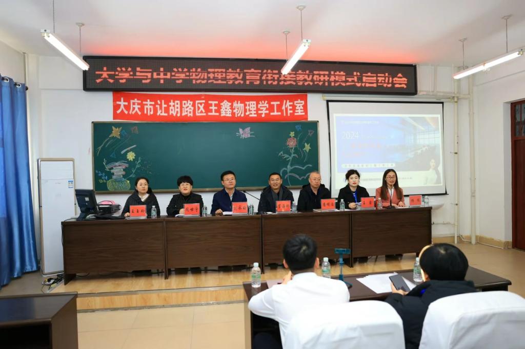 教研活动现场,气氛热烈,众多教育领域的精英齐聚一堂。让胡路区进修学校校长崔海彬、副校长潘明浩、初中物理工作室负责人王鑫,以及球王会官网,球王会体育院长刘永皓、党总支书记闻世宇、副院长王玉玲、物理学专业全体教师和来自大庆市让胡路区11所初级中学的物理骨干教师出席会议,会议由物理学专业负责人杨瑞主持。启动会上刘永皓介绍了物理学专业“一融合三突出”特色、师资力量及发展状况,崔海彬立足基础物理教育现状、对师范生的职业技能培养方向进行方法指导、与会双方表达长期合作的意愿。