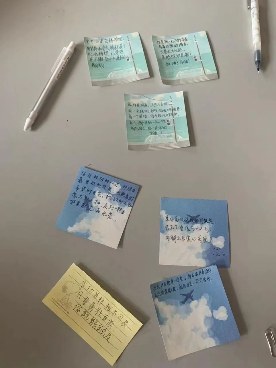 活动通过板报、手抄报以及激励便签等多种形式,为学生们营造了一个精神的避风港,每一张便签都承载着鼓舞人心的讯息。同学们通过各种形式留下温暖的寄语“每一次辛勤的耕耘,都是通往辉煌未来的坚实步伐,坚信自我,你必将抵达!”、“无论风雨,不忘初心,你的努力终将照亮前行的路。”一句句温馨话语激励学生们勇敢地面对学业和生活,简短的文字,提醒同学们在追求梦想的征途上,他们并不孤单。