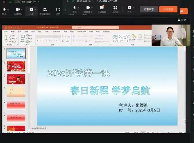 3月13日,学院党总支书记闻世宇为同学们讲授“开学第一课”。会上,她借助国产动画电影《哪吒之魔童闹海》开启互动,分享剖析其中的精彩片段,带领同学们深挖电影内核,鼓励同学们突破舒适区,扩大视野区,打造更好的自己。她对2025年全国两会精神进行了传达和解读,对于国家的发展形势和就业的现状进行了分析,鼓励同学们树立长远目标和短期目标,努力学习专业知识,不断提升自己的综合素质。对党员同学和学生干部提出要求,要扛起担当,做青年中的引领者和榜样,积极参与社会实践和志愿服务活动,廉洁做好组织交付的各项工作。希望全体同学在学校审核评估、专业认证、60周年校庆中贡献机电学生力量。最后,闻世宇以习近平总书记新年贺词的结束语勉励同学们:梦虽遥,追则能达;愿虽艰,持则可圆。愿同学们新学期一路披荆斩棘,追梦达愿,勇往直前!