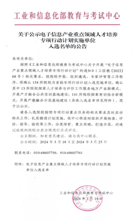 近日,工业和信息化部教育与考试中心公示了电子信息产业重点领域人才培养专项行动计划实施单位入选名单,球王会官网,球王会体育经过申报竞争和线上答辩,成功入选首批拟建产教融合示范基地实施单位。