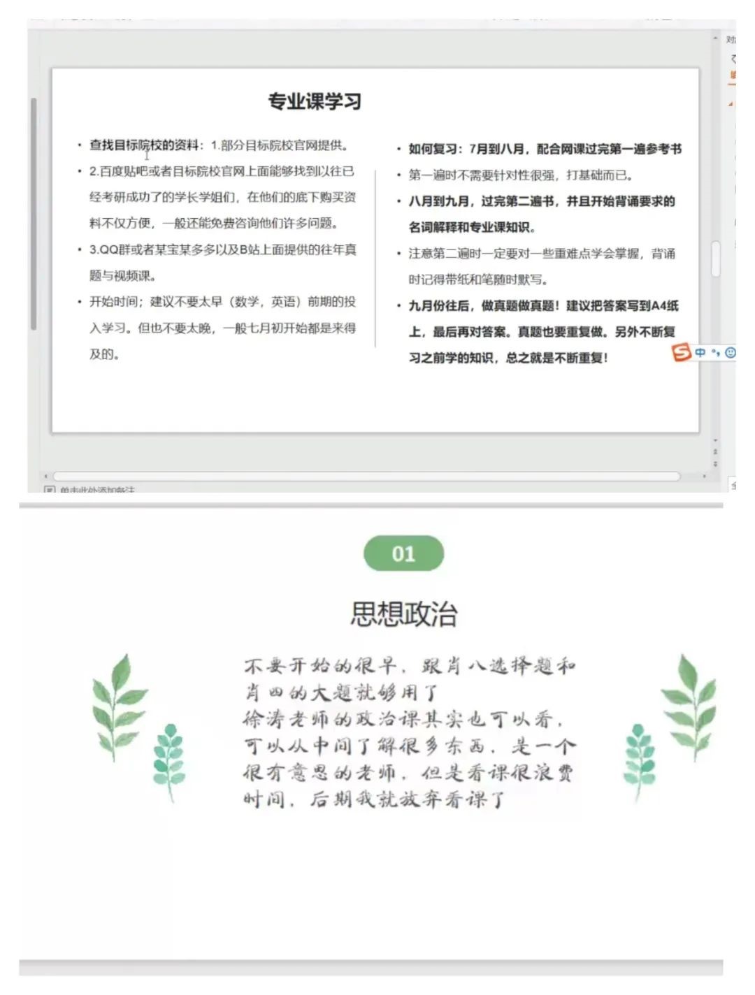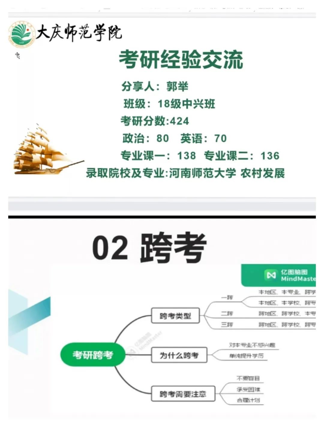郭举同学以424分的优异成绩被河南师范大学录取,也是跨专业考研的代表。他说:“考研的成功等于正确的方法、不懈的努力、良好的心态以及恰当的复习资料”。他风趣的语言、开门见山的讲述风格、清晰的条理,赢得了屏幕下方的数条点赞。